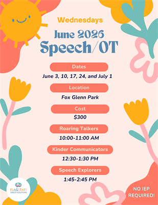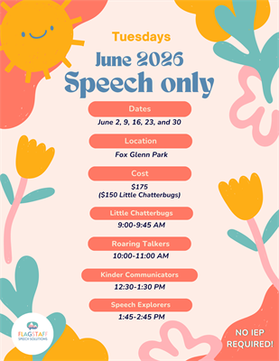 Sign up for a single week or the whole month of June and watch your child build confidence, make new friends, and have a blast at Flagstaff Speech Solutions Summer Speech Camp—where learning to talk is as fun as a summer day!