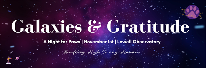 Step into a starlit evening where compassion meets celebration. Join us at the incredible Lowell Observatory for Galaxies & Gratitude: A Night for Paws, a sparkling night of giving back to the pets who need us most. The evening begins with a dazzling presentation in the Lowell Theater, setting the stage for a night filled with casino-style games, drinks, and hors d’oeuvres under the stars. Our live auction will shine bright with extraordinary items to support the lifesaving mission of High Country Humane. Come dressed in your cocktail attire and prepare for a constellation of fun, generosity, and unforgettable memories.